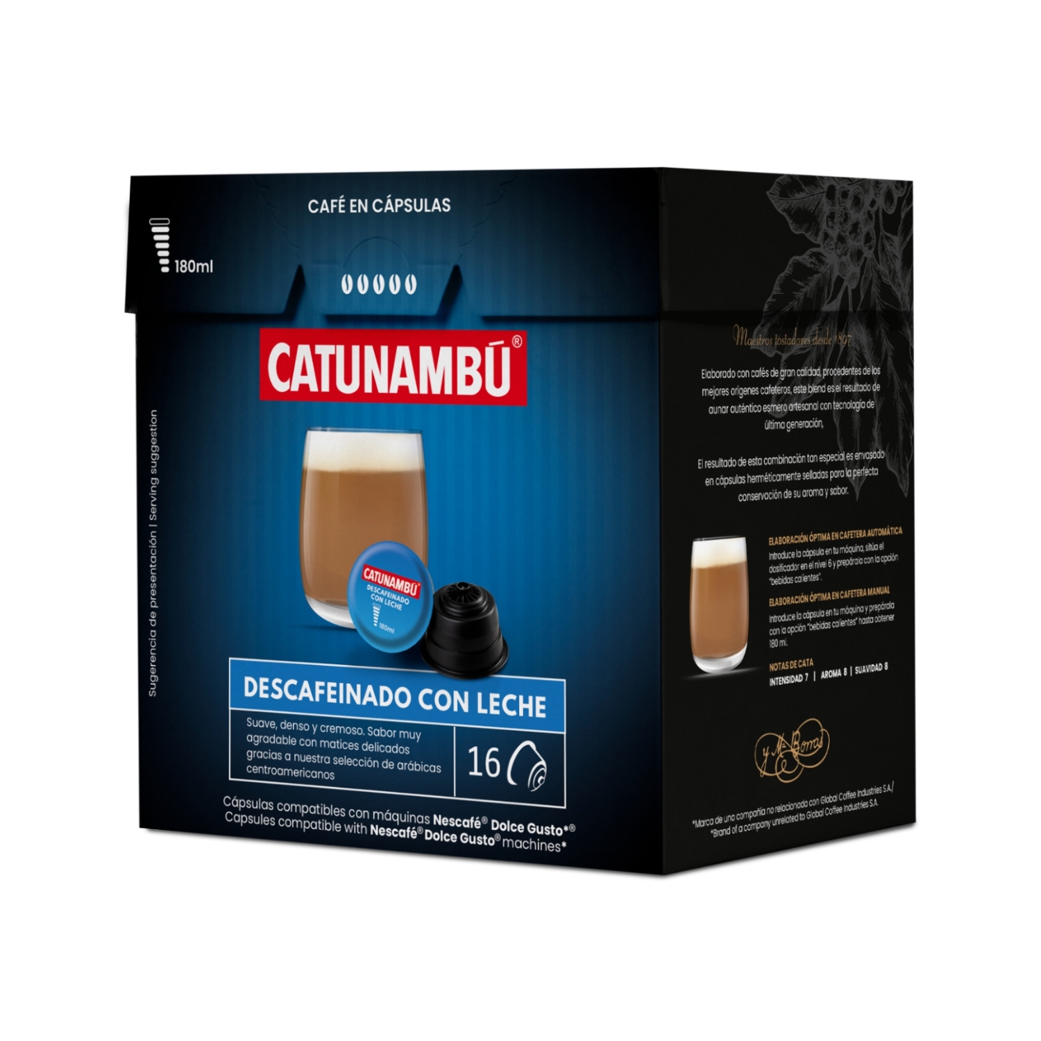 Nuestras cápsulas de café descafeinado con leche Catunambú están elaboradas con los mejores granos de café y exquisita leche, combinación que garantiza una experiencia de sabor excepcional en cada sorbo. Además, al ser compatibles con las cafeteras Dolce Gusto®, preparar tu café descafeinado con leche nunca ha sido tan fácil y conveniente.